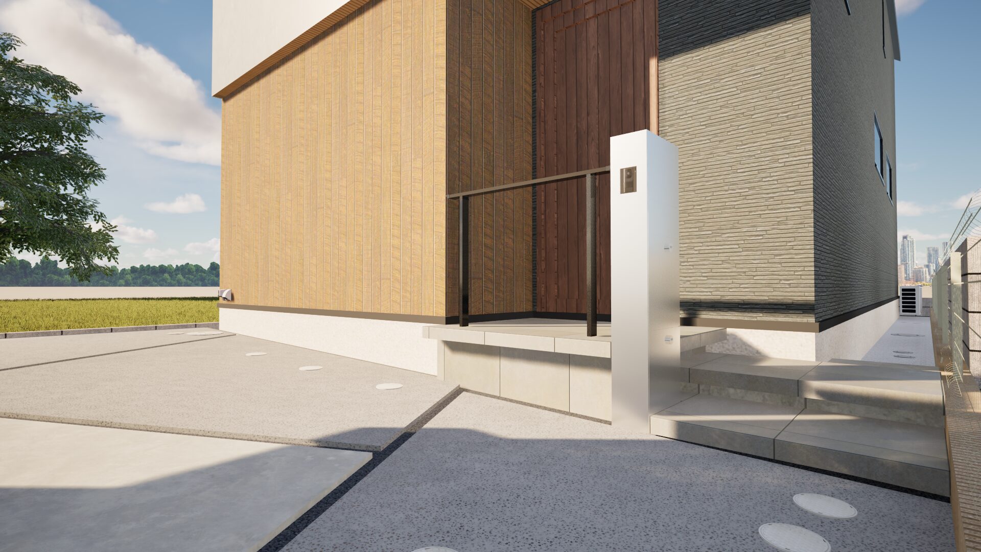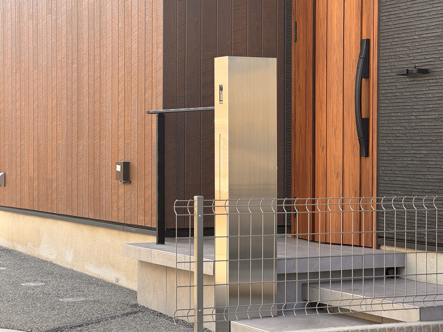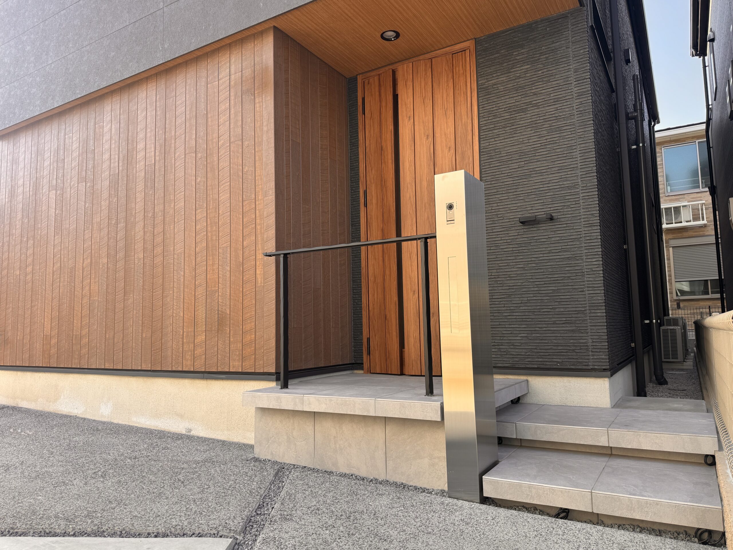 ご要望をデザインに取り入れ、機能門柱を階段に巻き込むように配置